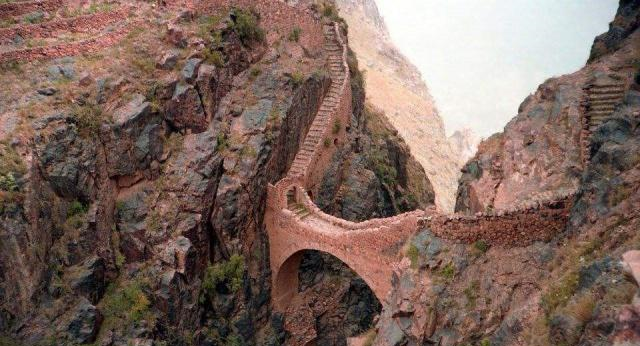 这座被称为“沙哈拉之桥”是横跨在两座高山之间的,海拔在2600米,因为桥窄且高,走上去有种胆颤心惊的感觉,恐高者绝不敢低头往下看,因为站在桥上,两侧的悬崖陡壁清晰可见,深不见底的峡谷就在脚下,仿佛有一双黑洞般的眼睛在凝视着你,让人不寒而栗。